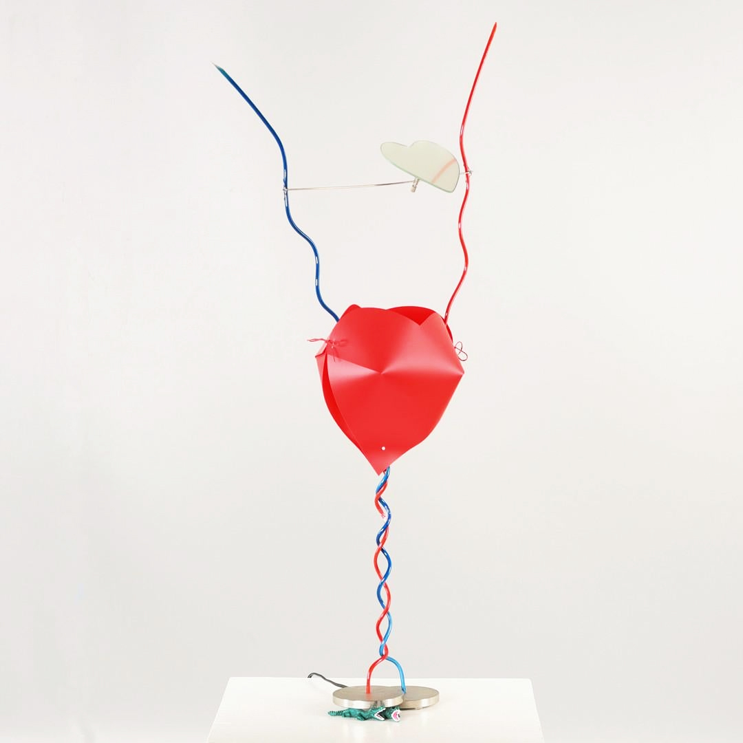 Originally intended as a wedding gift, Ingo Maurer’s One from the Heart is a love letter in lamp form. A voluptuous 3-dimensional heart is illuminated by a 9W LED, while red and blue cables rise like outstretched arms, holding a heart‑shaped mirror that invites tinkering with the light’s reflections. The bi‑level base – propped on one side by two snappy, green crocodiles – adds Maurer’s signature wink, perhaps as a sly commentary on marriage. At 15.75″ w x 5.91″ d x 37.4″ h, this table lamp is quirky, witty, and unmistakably Maurer.