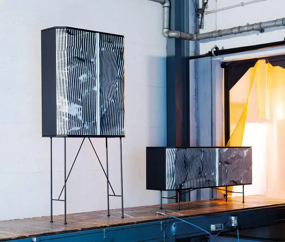 Italian fashion house Diesel partnered with Moroso to create edgy, contemporary furniture for its Diesel Living line. The resulting Perf Stripe Bar Cabinet is a striking fusion of raw industrial style and refined detailing. Its most distinctive element is the doors: an ultra-high-resolution scan captures the unique texture of Diesel’s jacquard denim, which is then transferred via a special liquid lacquer technique onto the doors to form irregular black and white stripes. Full-length door handles come standard in Diesel White with red as an option. The cabinet’s frame and bottom panels are of matte black lacquered steel, while the top can be of matching steel or dark oak veneer. The striking lacquered steel doors are available in copper, black gloss or verdigris finish. Cabinet dimensions are 80 cm (31.5”) w x 29 cm (11.42”) d x 170 cm (66.93”) h. Each unit is made to order in Italy, with a lead time of 4-6 weeks.